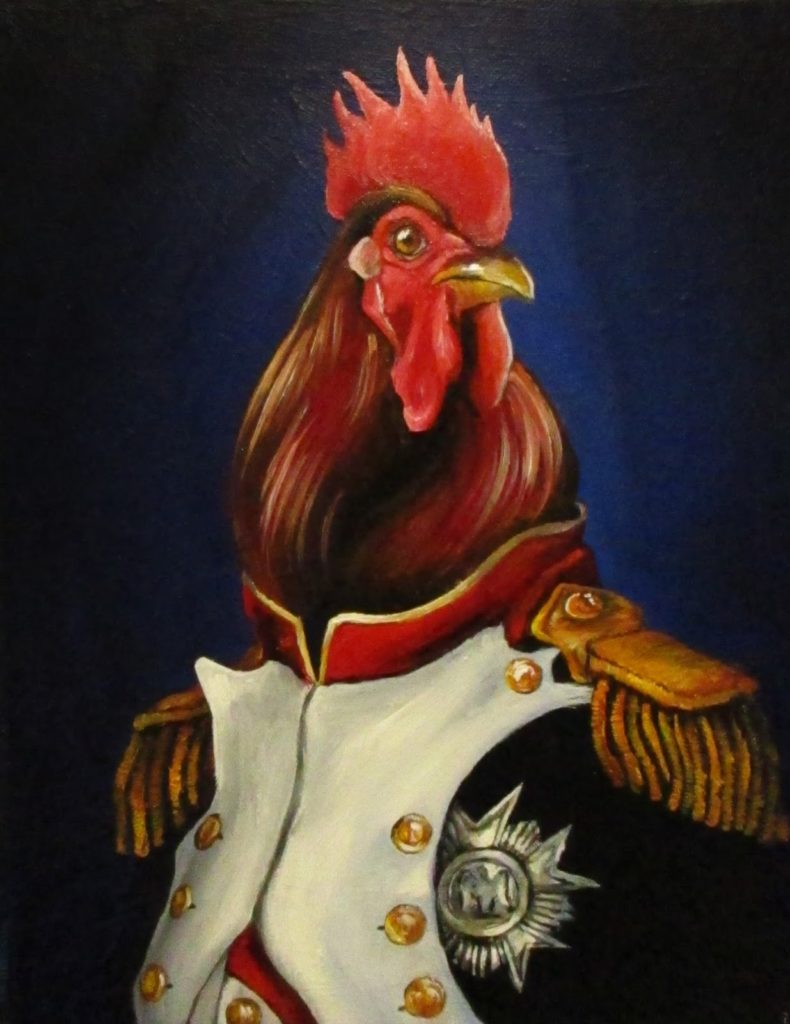 The cockerel is also a symbol for regeneration, awakening and strength and finally, the work refers, in an ironic way, to male-defined British society and thoughts about biological determinism.”