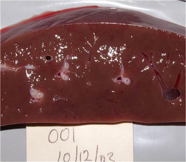 This glistening wake of worms and mucus can be seen in the images below of liver flukes in humans. This picture is of the cross-section of an infected liver, the white spots are inflamed bile ducts with flukes inside.