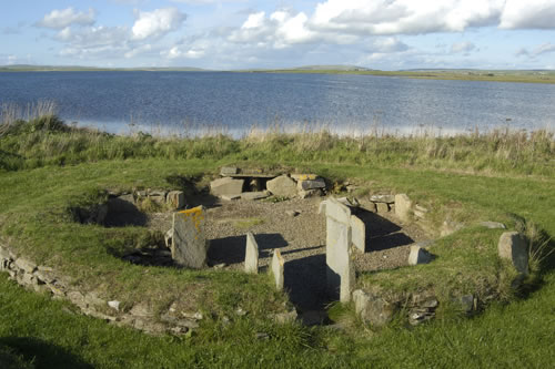 One of the stones here was known as the Odin Stone, or Stone o’ Odin that stood in a field by the Standing Stones o’ Stenness until the winter of 1814 when a local farmer had demolished it. The stone stood approximately 2.5 metres (8 feet) high, with a breadth of about one metre (3.5 feet), and had a hole a little bigger than a human head right in the middle of it.
